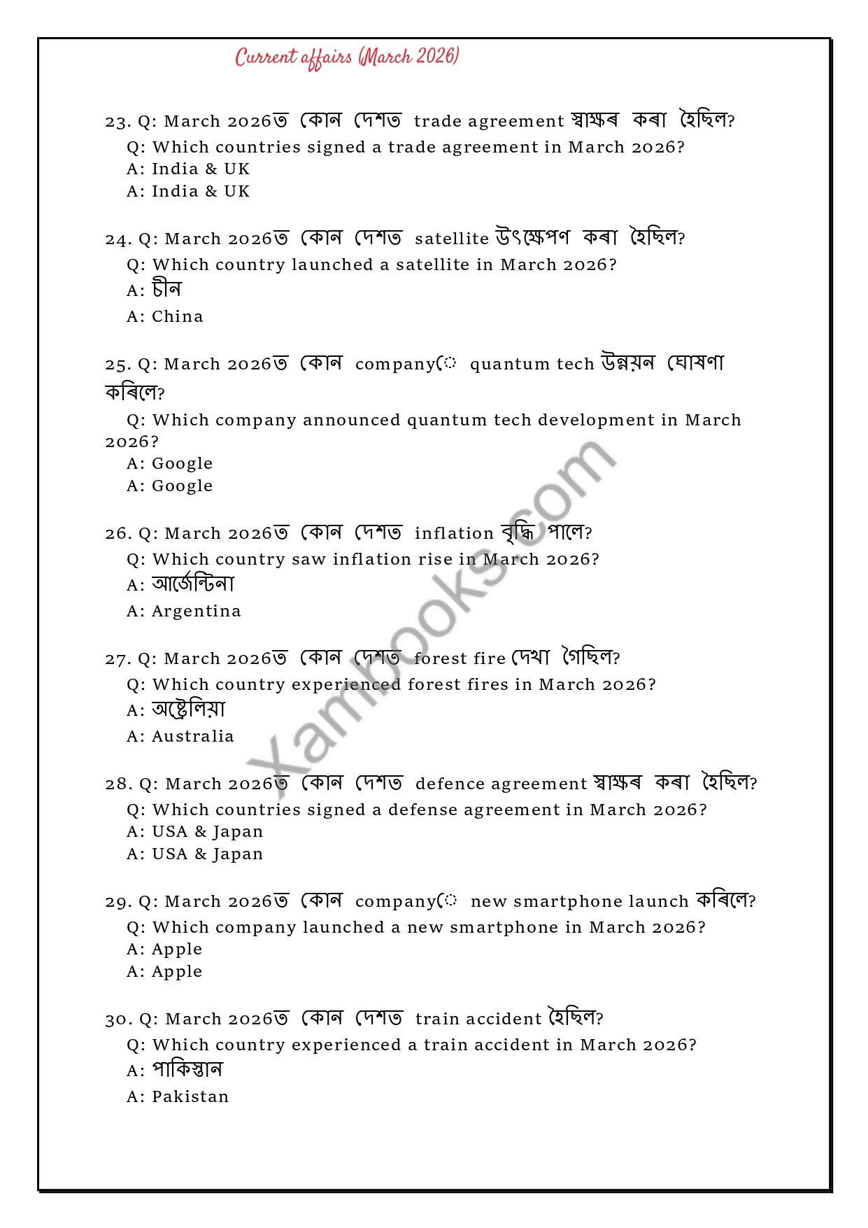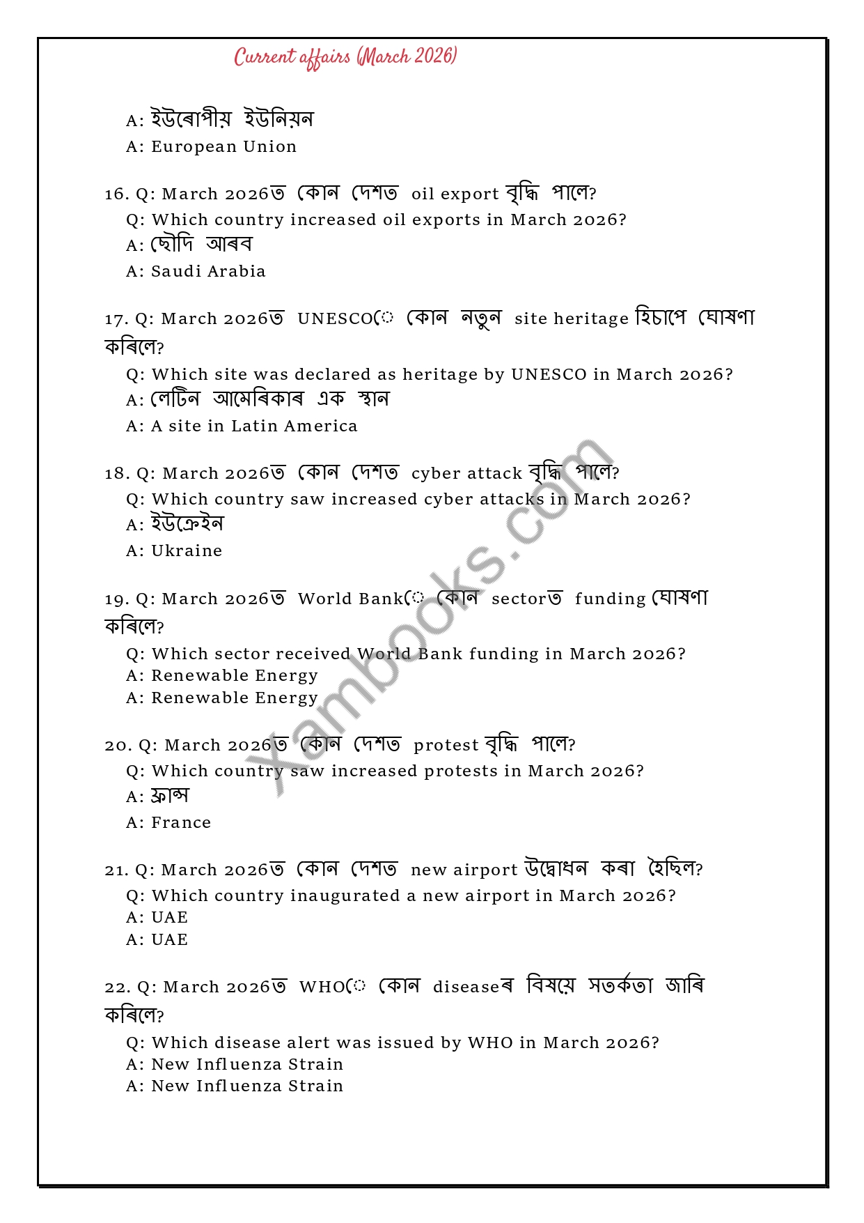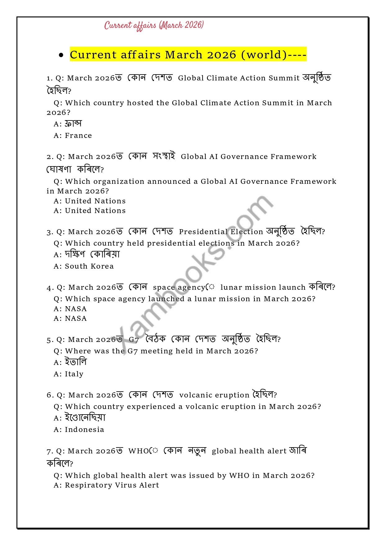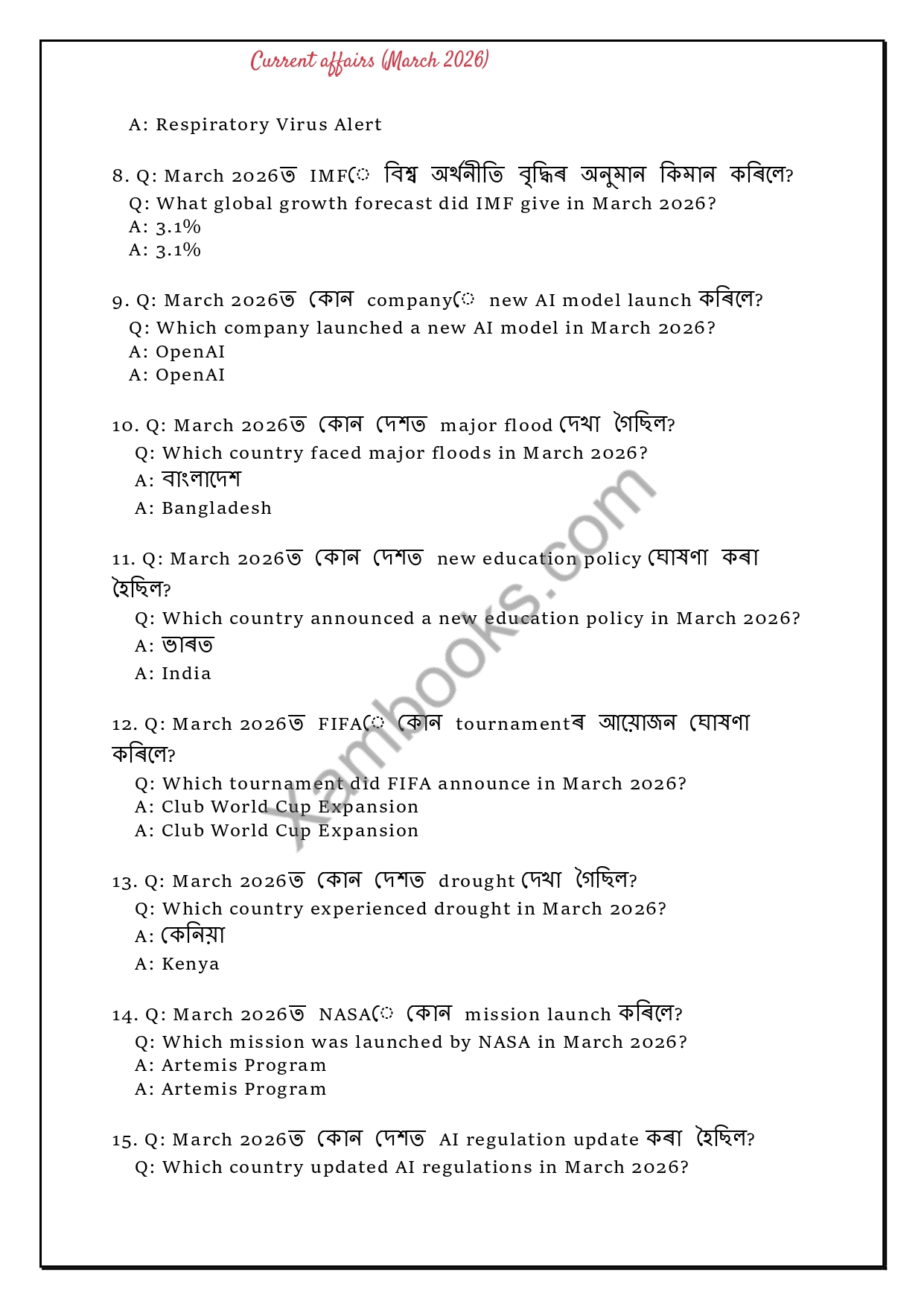 Stay ahead in your exam preparation with this comprehensive and exam-focused Current Affairs eBook for March 2026. Carefully curated for aspirants of competitive exams like APSC, Assam Police SI, ADRE, PNRD, SSC, Banking, and other state-level exams, this eBook covers all the important national and international events of the month in a crisp and easy-to-revise format.